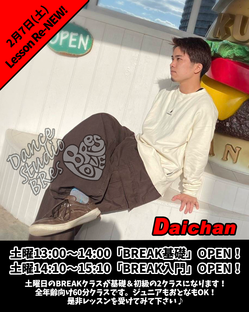 「BREAK入門」毎週土曜日:14:10~15:10(60分)対象:小学生~おとな 講師:だいちゃん